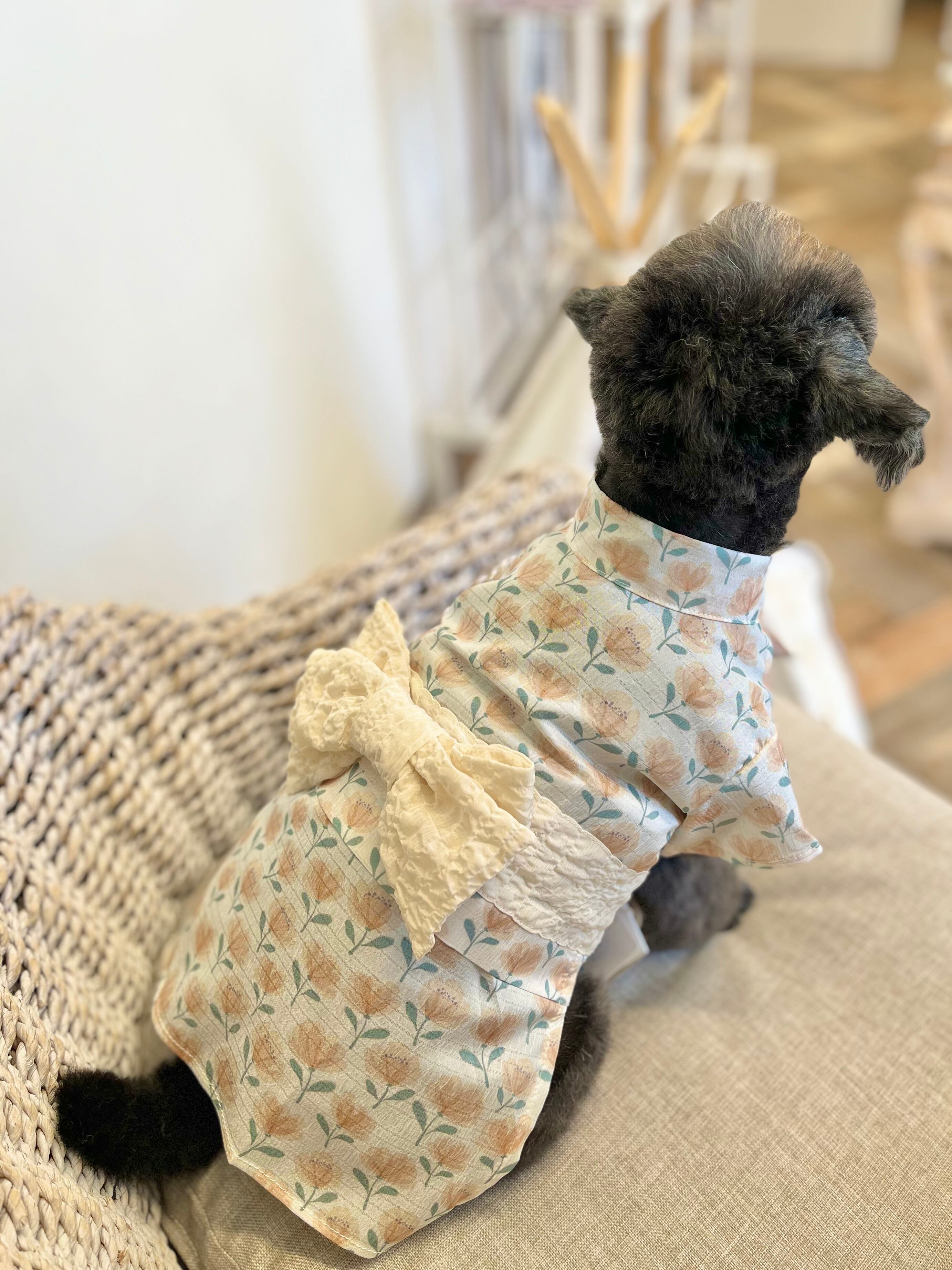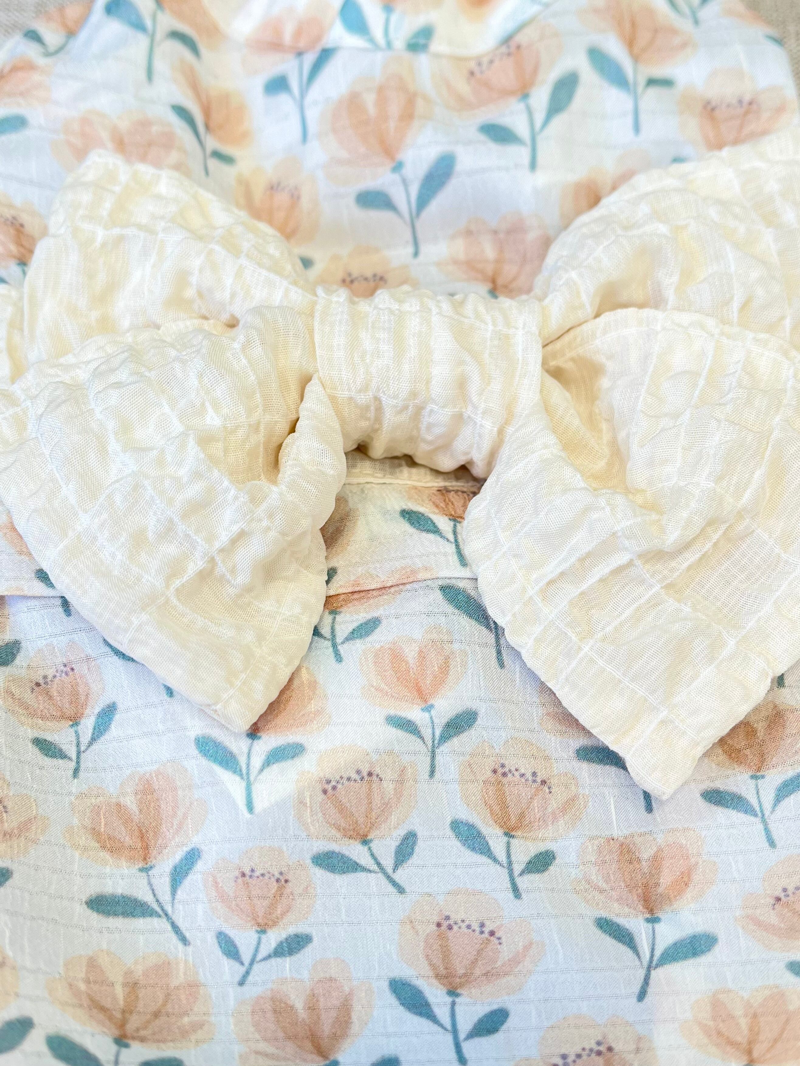 淡いオレンジカラーのお花とふんわりした大きなリボンで女の子らしさ全開♪