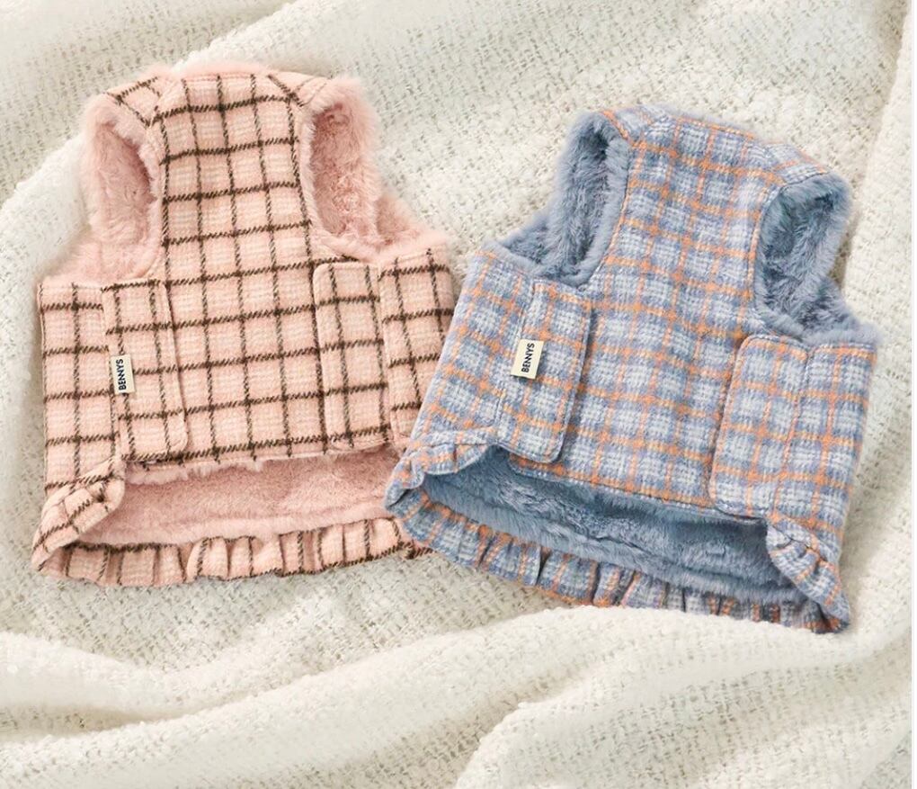 クラシックなチェックとラブリーなカラーをミックスした"ウィークエンドチェックワンピーズファー裏地で保温性を高め、肩ヒモとサイドオープンで楽に着られます。